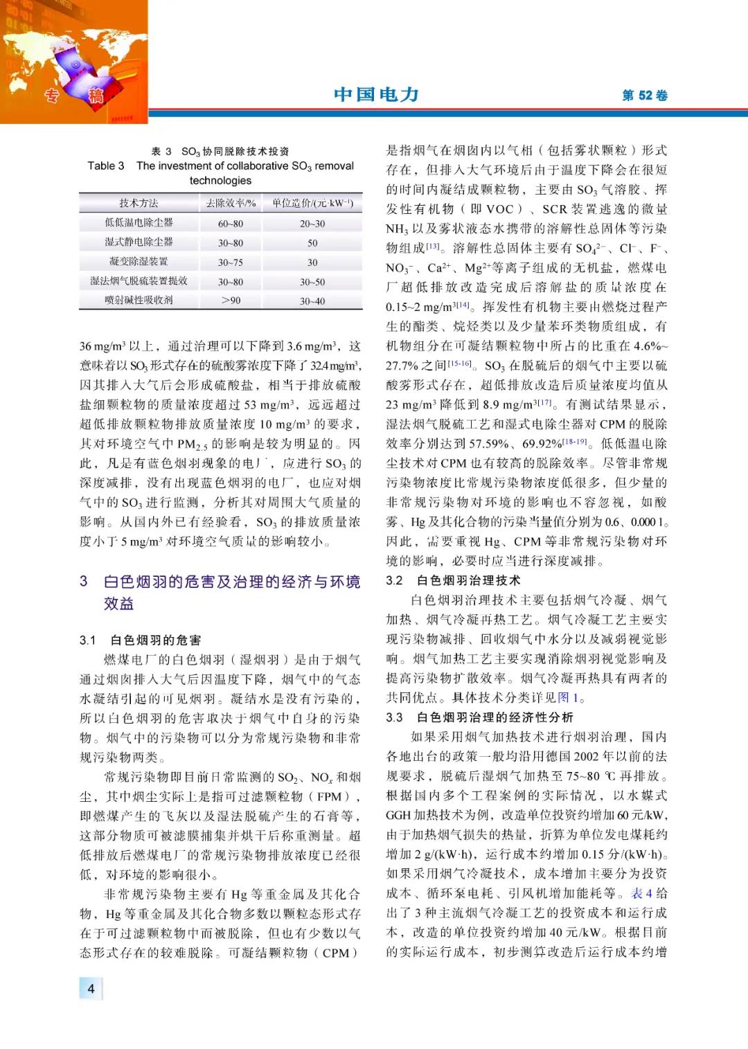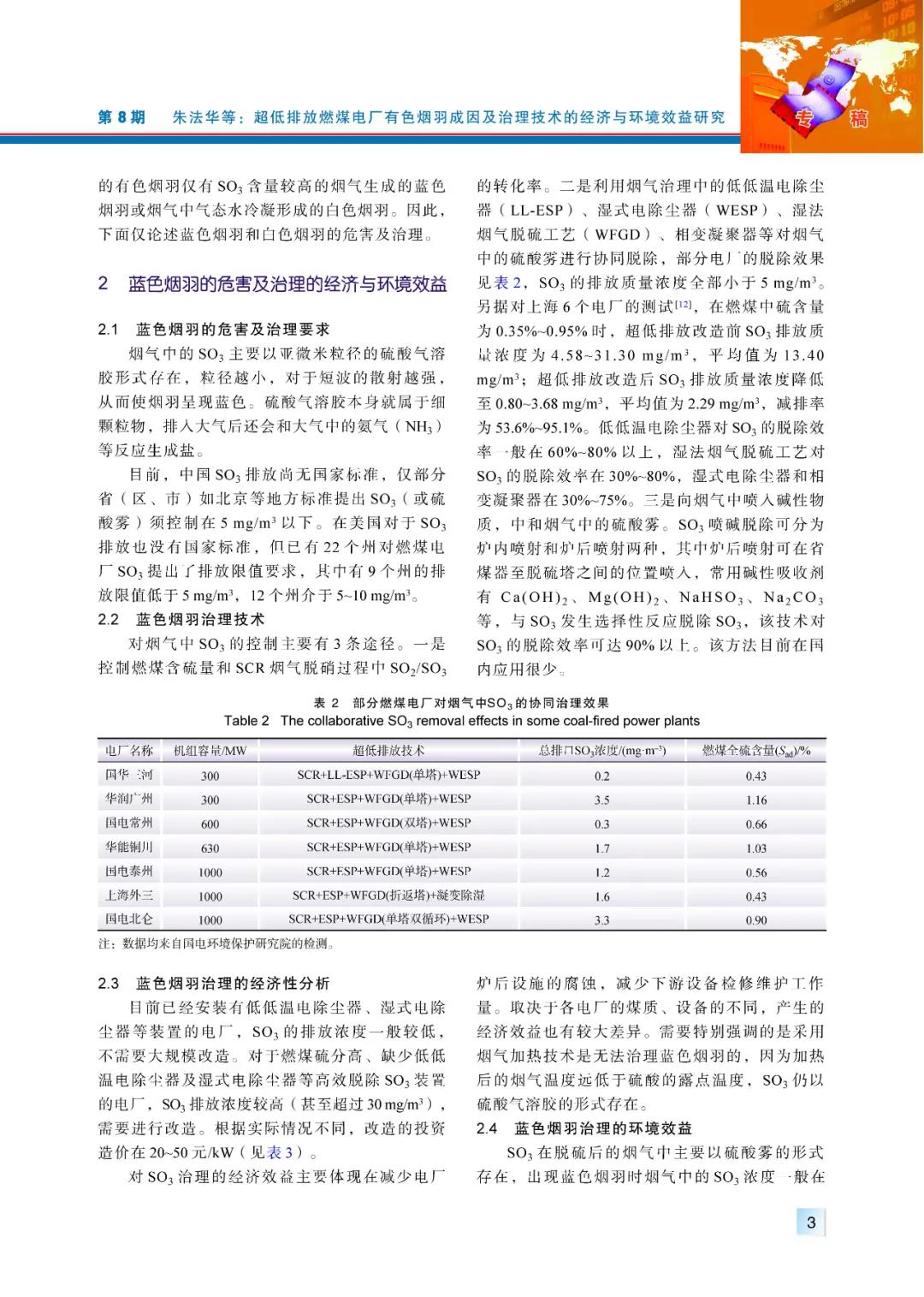 (3)藍(lán)色煙羽是排放煙氣中硫酸霧濃度較高造成的,目前中國尚無燃煤電廠硫酸霧(SO3)的排放標(biāo)準(zhǔn),各地出臺的治理要求也非?;靵y。治理煙氣中的SO3主要有3條途徑,一是降低燃煤含硫量并控制SCR煙氣脫硝工藝中SO2/SO3轉(zhuǎn)化率,二是提高低低溫電除塵器、濕式石灰石–石膏法煙氣脫硫工藝、濕式電除塵等煙氣治理設(shè)施對SO3的協(xié)同脫除效率,三是向煙氣中噴入堿性物質(zhì),中和煙氣中的SO3。煙氣加熱對治理藍(lán)色煙羽沒有任何效果,藍(lán)色煙羽治理對降低當(dāng)?shù)丨h(huán)境空氣中的PM2.5較為有利,投資與運(yùn)行成本不是很高。