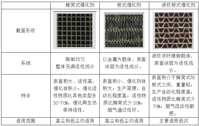 目前常規(guī)的催化劑類型有蜂窩式催化劑、板式催化劑、波紋板式催化劑。對三種不同型號的催化劑進(jìn)行對比(表2):